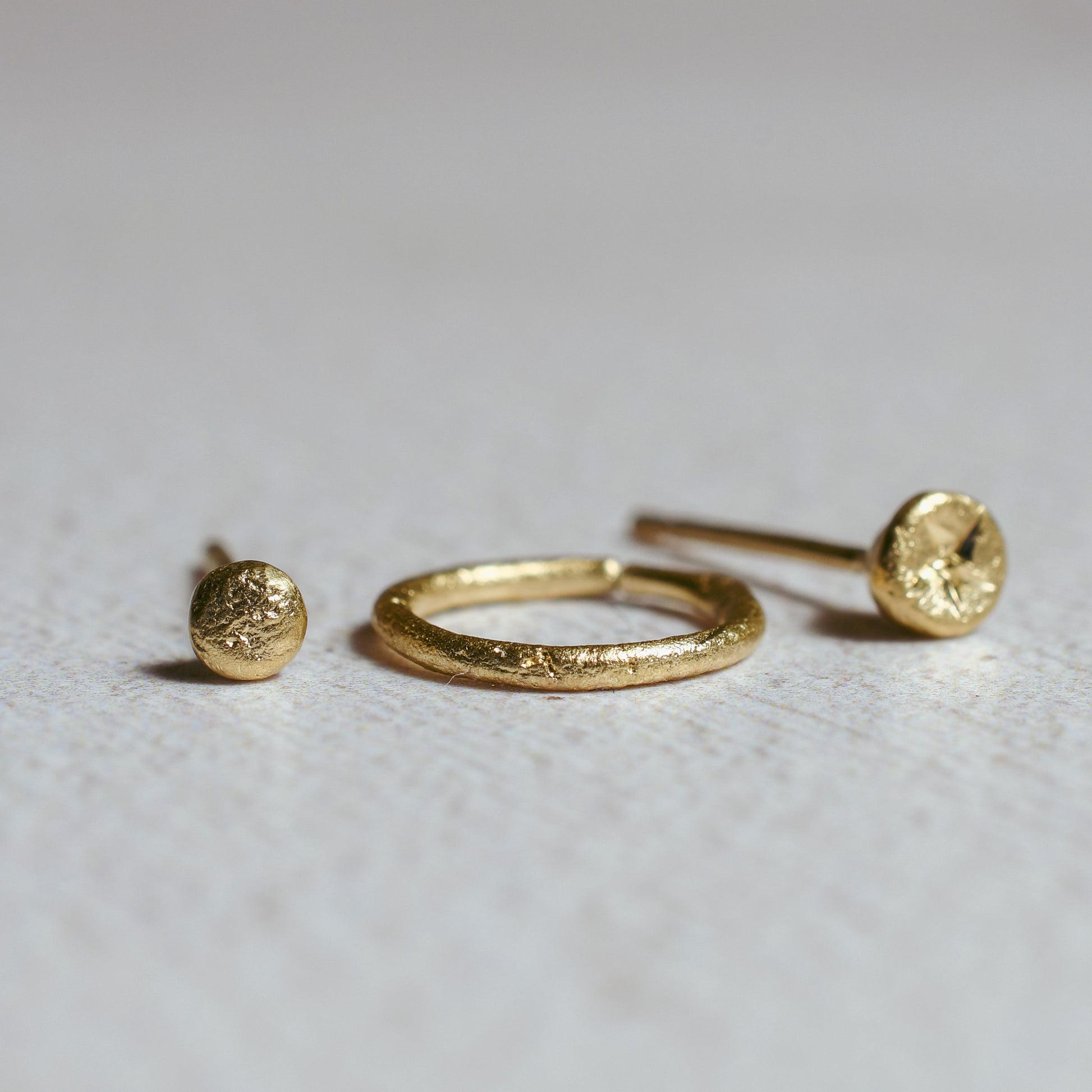 A pair of 9 carat solid gold sleeper hoop earrings, gently textured circles inspired by ritual and relic, designed to put in and leave in for luminous, effortless daily wear. Suitable to wear in multiple positions in the ear or for nose piercings.