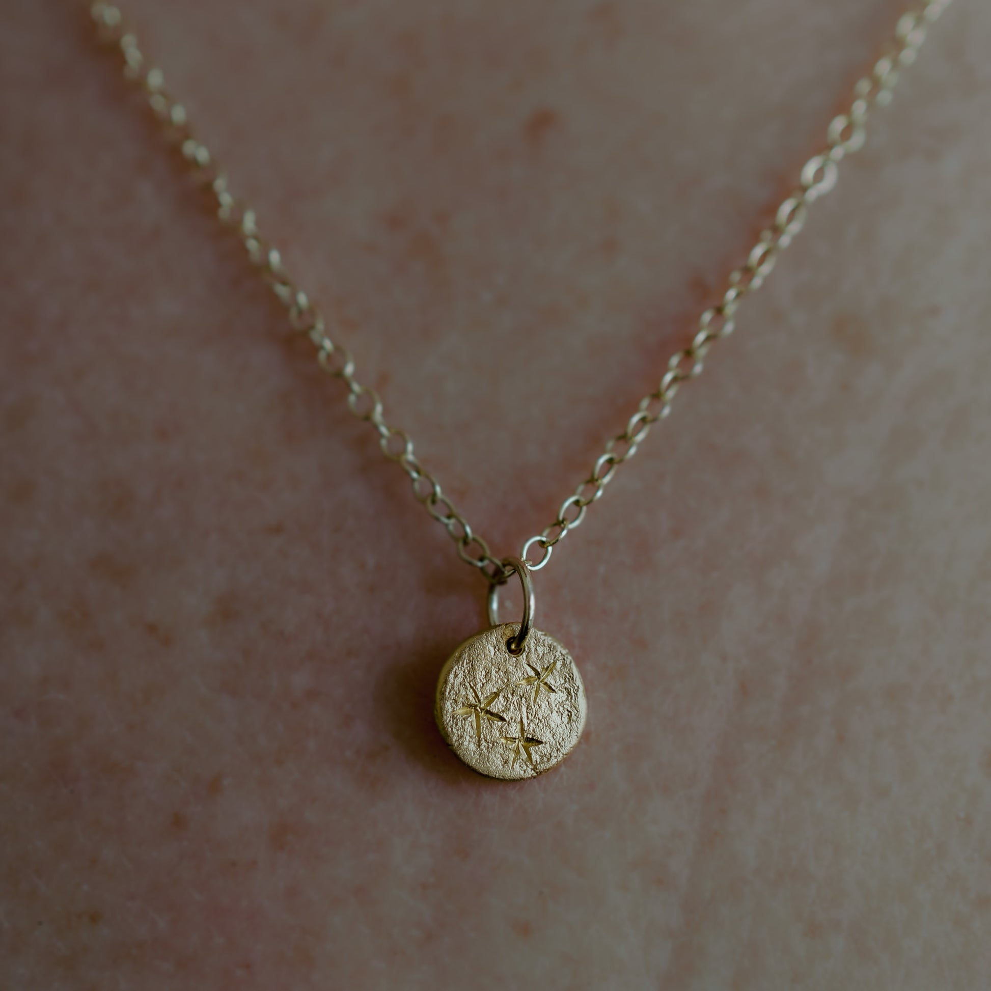 A gently textured gold disc pendant, shaped like the sun and scattered with hand-engraved stars. A timeless classic and an elevated everyday staple for lovers and dreamers, echoing ancient coin pendants and the quiet symbolism of stars. One to reach for everyday - a modern talisman rooted in ancient forms.