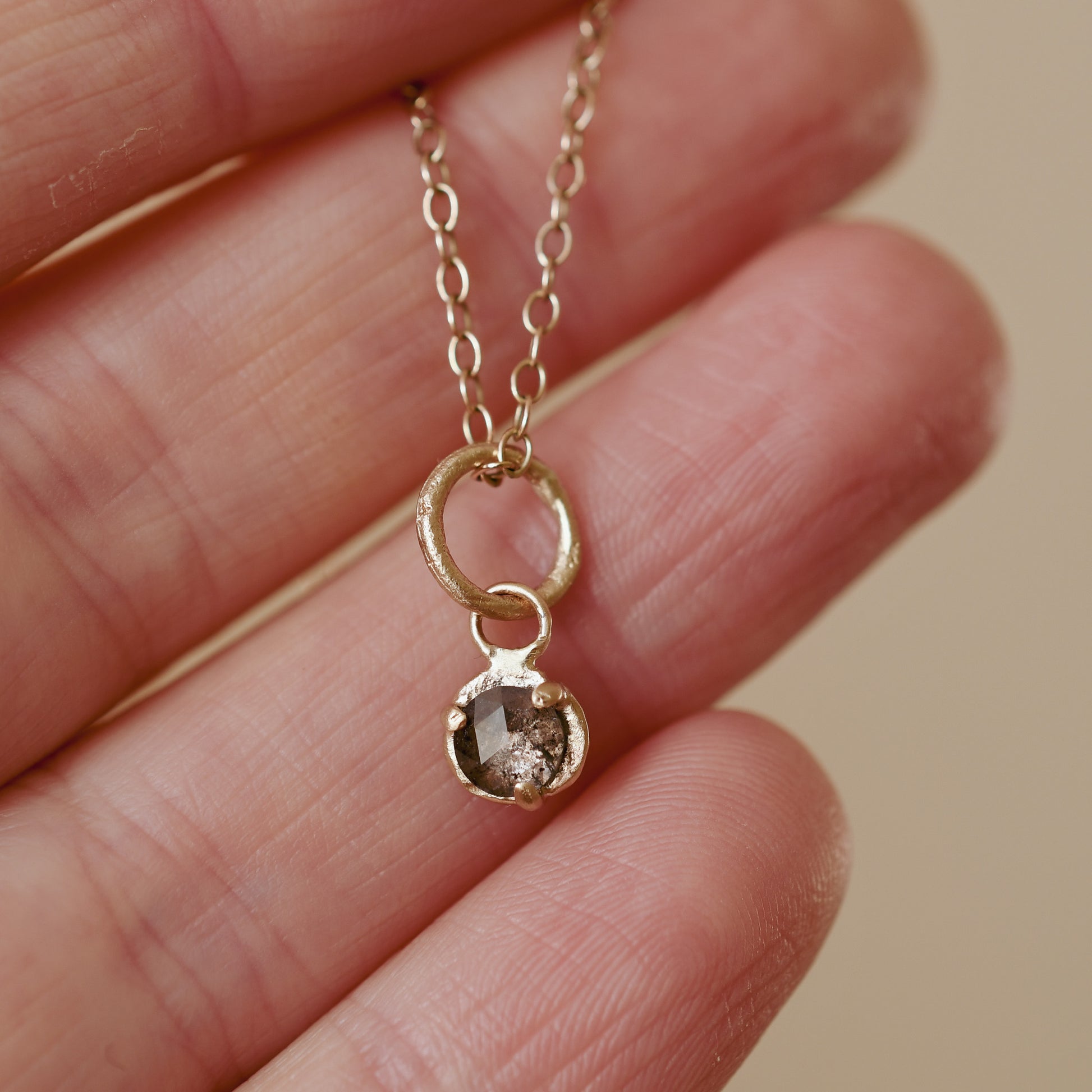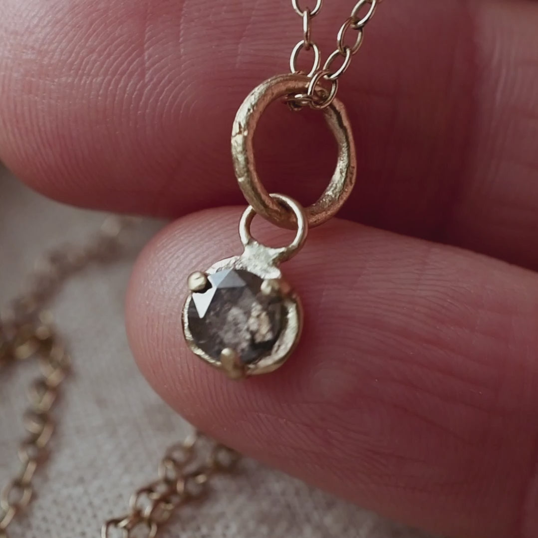 A striking diamond solitaire pendant. This one-of-a-kind jewel features a stunning slice of salt and pepper diamond set into my signature textured gold. The diamond has a bright shimmer and a soft metallic lustre, and a complex colouring - clouds of stormy charcoal grey clearing to patches of bright, starry clarity, shining gold from the metal beneath. Truly magical, the shimmer and sparkle from this stone is unreal.