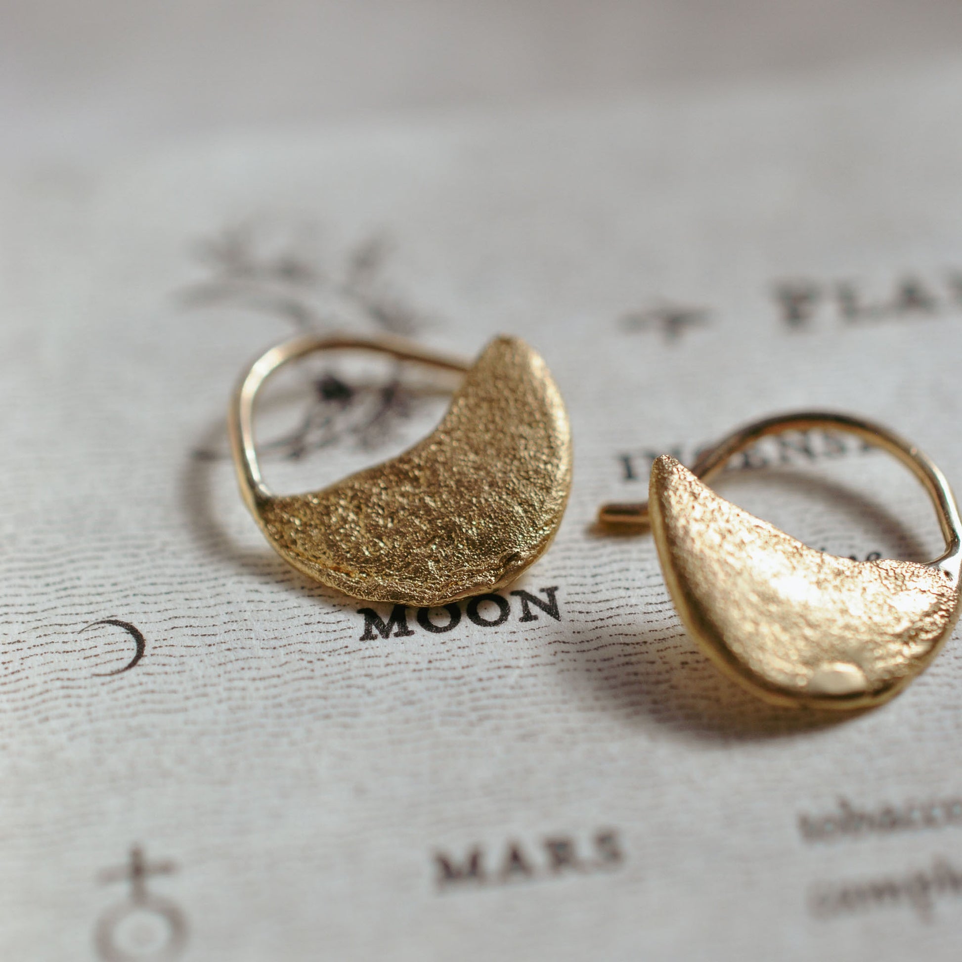 Richly textured crescent-shaped earrings, perfectly weighted cradles of gold, meticulously crafted by hand to add a little celestial, rough-luxe magic to your everyday.